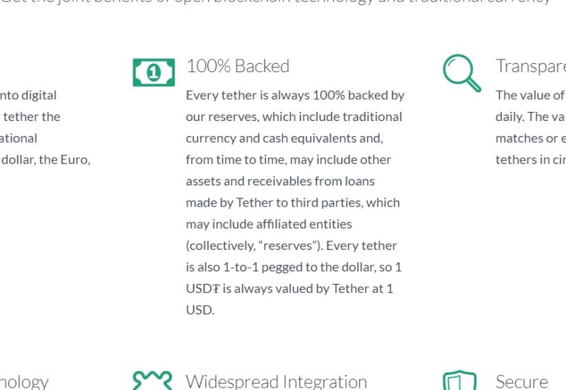 „Každý Tether je vždy 100 %-ne krytý našimi rezervami, ktoré zahŕňajú tradičné meny, hotovosť a z času na čas pôžičkami od spoločnosti Tether tretím stranám, čo môže zahŕňať spriaznené entity. Každý USDT token je tiež 1-k-1 krytý dolárom, takže hodnota 1 USDT je vždy ohodnotená na 1 USD.“