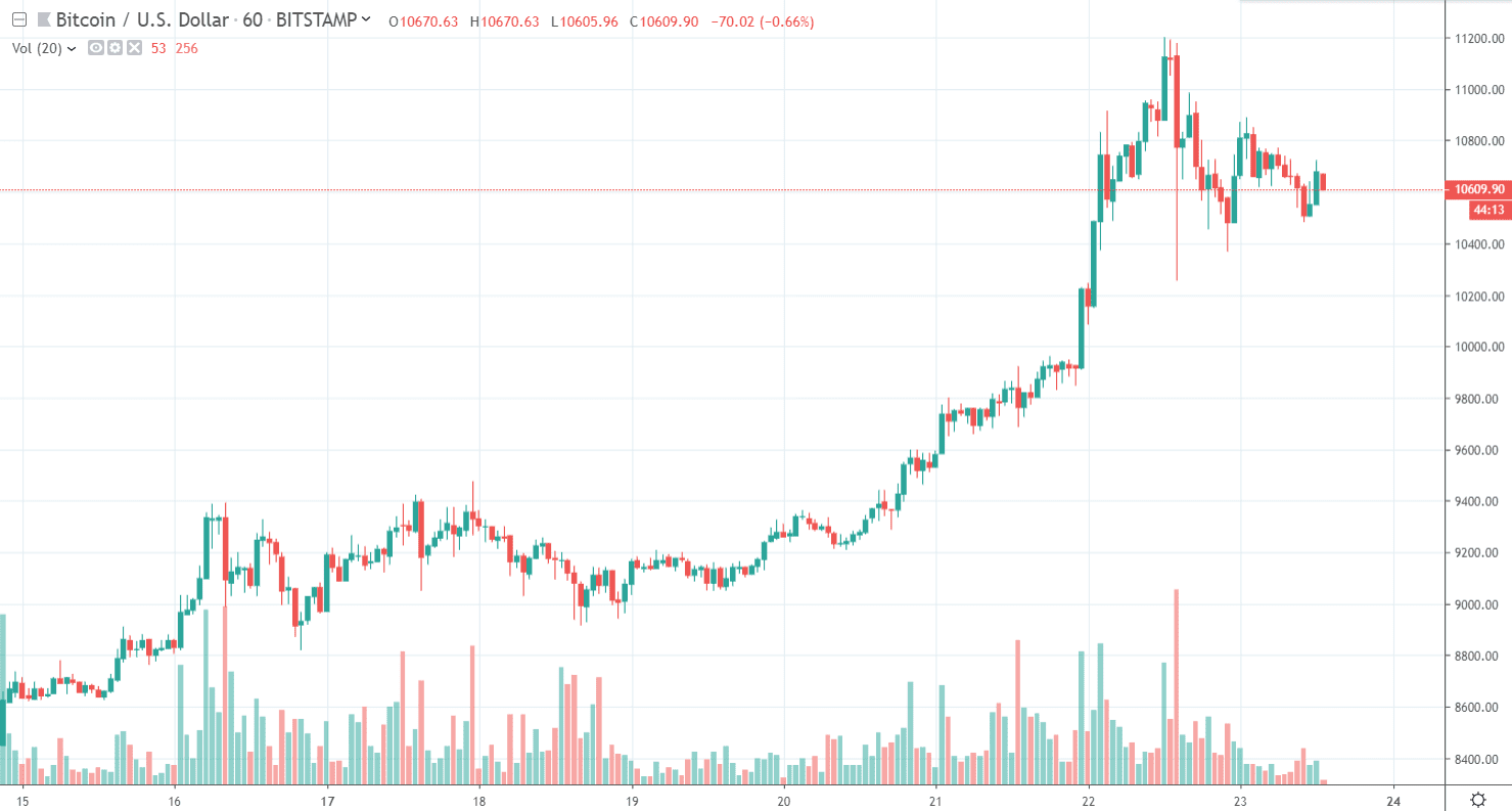 Bitcoin pokračuje vo fenomenálnom rallye a včera (sobota 22.6.) zvýšil svoju hodnotu o neuveriteľných 15 %. Aktuálne high leží na úrovni ~11 200 $ (Bitstamp) a dnes zaznamenávame miernu korekciu. Bitcoin sa v čase písania tohto článku obchoduje za 10 650 $ a na hodinovom grafe vytvára formáciu trojuholníka.