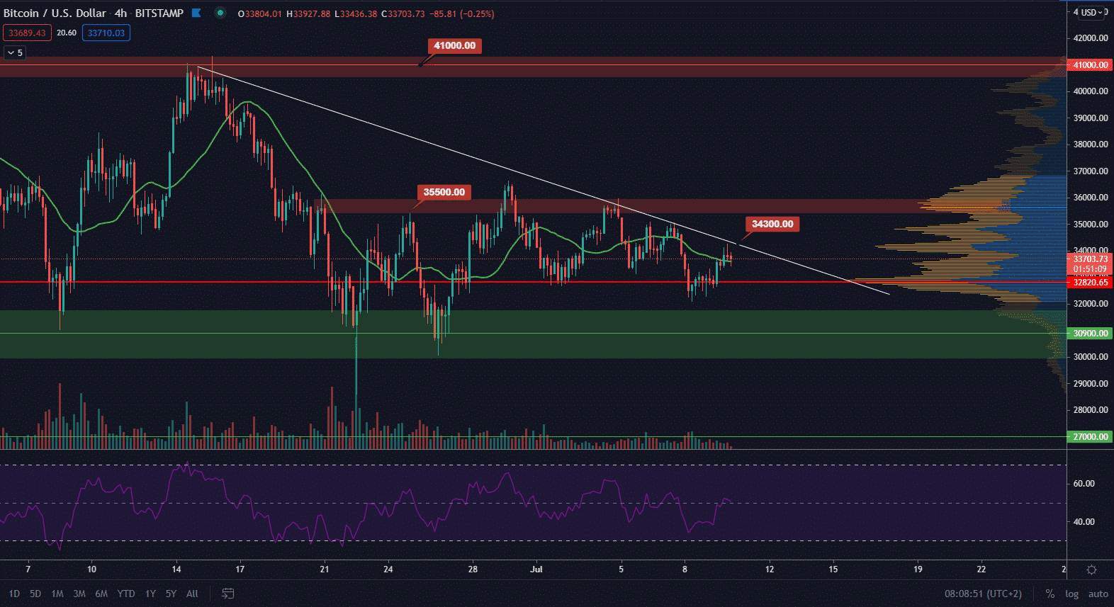 Van de Poppe sledoval potenciálny nárast až na 39 000 dolárov, ak by Bitcoiny prelomili  odpor na 35 500$. Hranica 39 000$ až 41 000$ je totižto horná hranica sideway štruktúry.