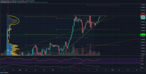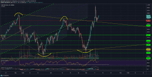 Tak tá aktuálna podoba trhovej štruktúry je rastúci triangel. A ako sami môžete vidieť, toho priestoru v rámci patternu veľa nie je. V týchto chvíľach sa nakupujúci snažia presadiť prerazenie, ale zatiaľ bez úspechu. Ak však k prerazeniu nakoniec dôjde, tak nás asi čaká posledná vlna smerom nahor pred dlho avizovanou korekciou.