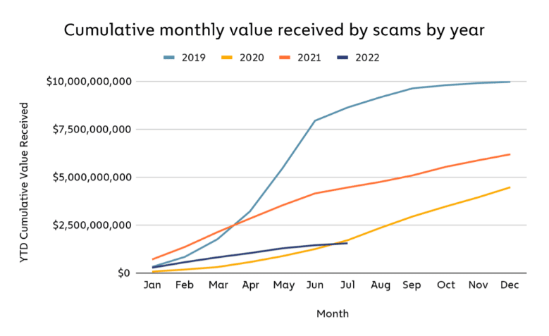 Peniaze z kryptomenových podvodov. Zdroj: Chainalysis