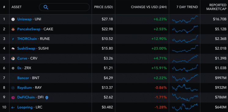 Decentralizovaná burza SushiSwap je aktuálne jasný lídrom s tokenom SUSHI v rebríčku DEX. Tento token vzrástol o 23 % za necelých 24 hodín.