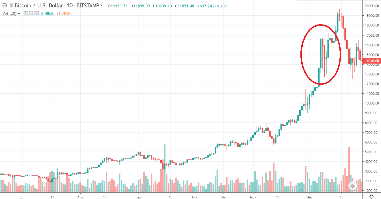 Pri pohľade na daily graf mi hneď napadá, že toto je jasný „bubble pattern.“ Bitcoin sa odrazil od hladiny 14 000 $ a túto stredu vytvoril prvé nižšie high – typické praskanie bubliny. Podobne to vyzeralo aj v rokoch 2013 a 2017.