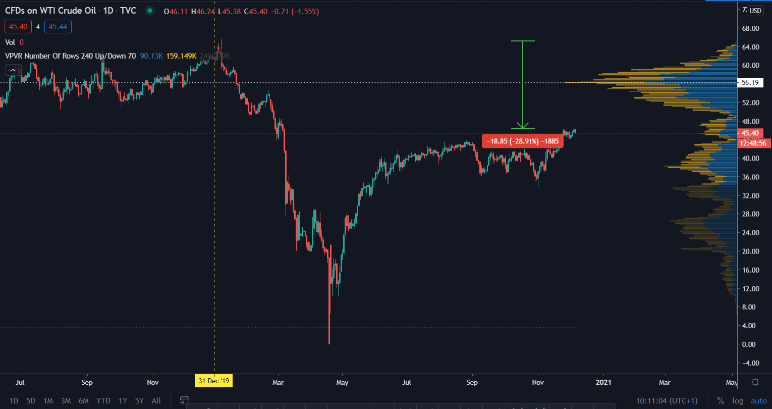 Momentálne však ceny ropy rastú už niekoľko týždňov po sebe. Brent sa pohybuje na úrovni 48,42$ za barel a WTI na úrovni 48,44$ za barel. Pozitívne správy o vakcíne podporujú tento rast a to hlavne z dôvodu uvoľnenia opatrení. Zvýšenie frekvencie cestovania by razantne zvýšilo dopyt aj po rope.