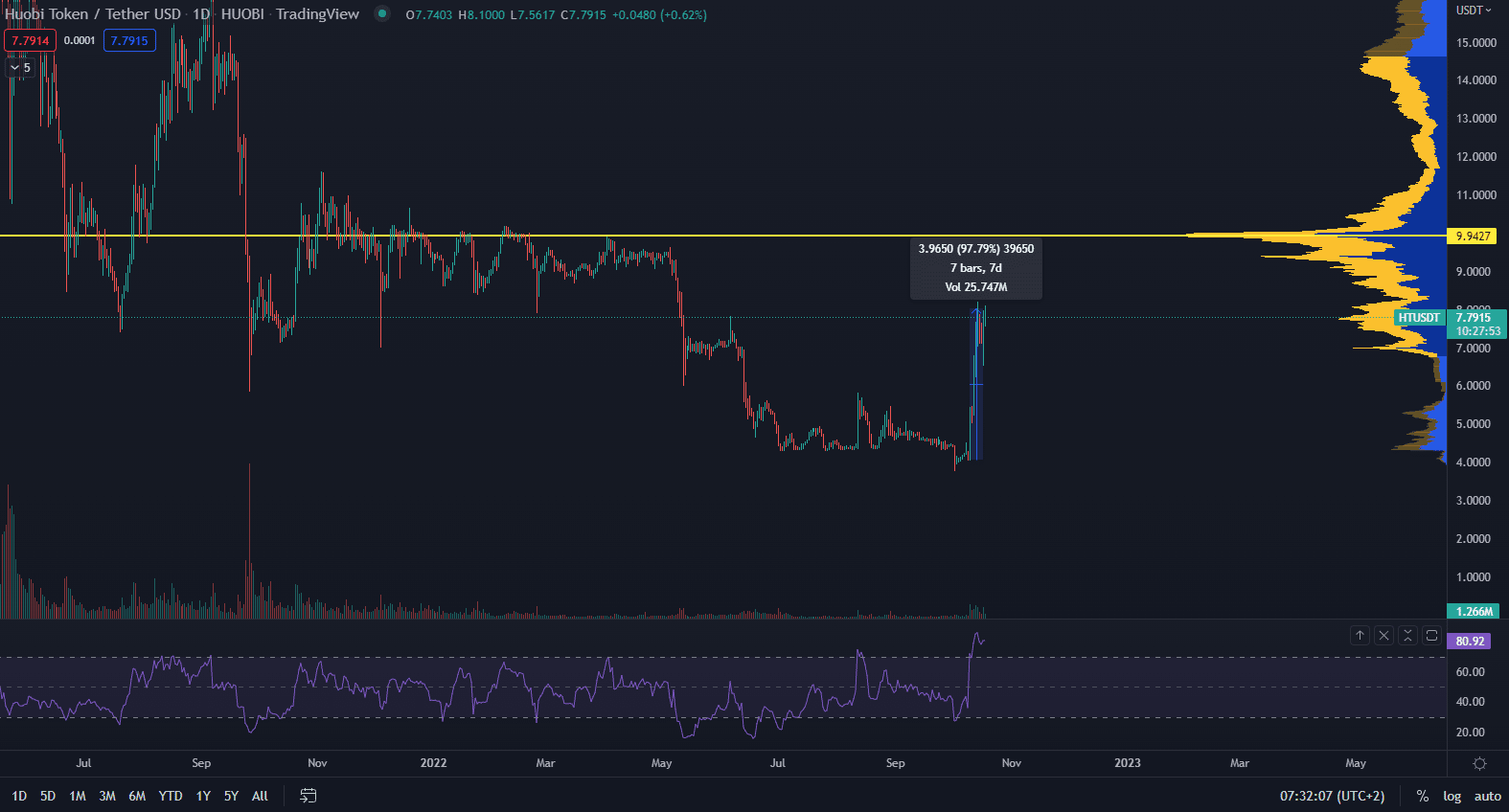 Huobi token (HT) je najvýkonnejšia kryptomena za posledných 7 dní. Ako vidíme na grafe nižšie, po dlhšej nízko volatilnej oblasti sa cena raketovo dostala na cenu 7,79 dolára v čase písania článku. Ešte pred týždňom sa cena pohybovala len tesne nad 4 dolármi. Z hľadiska technickej analýzy sa rezistencia nachádza na zóne od 8,50 do 10 dolárov. RSI taktiež signalizuje prehriaty trend, no z krátkodobého hľadiska cena ešte môže pokračovať do spomínanej zóny.
