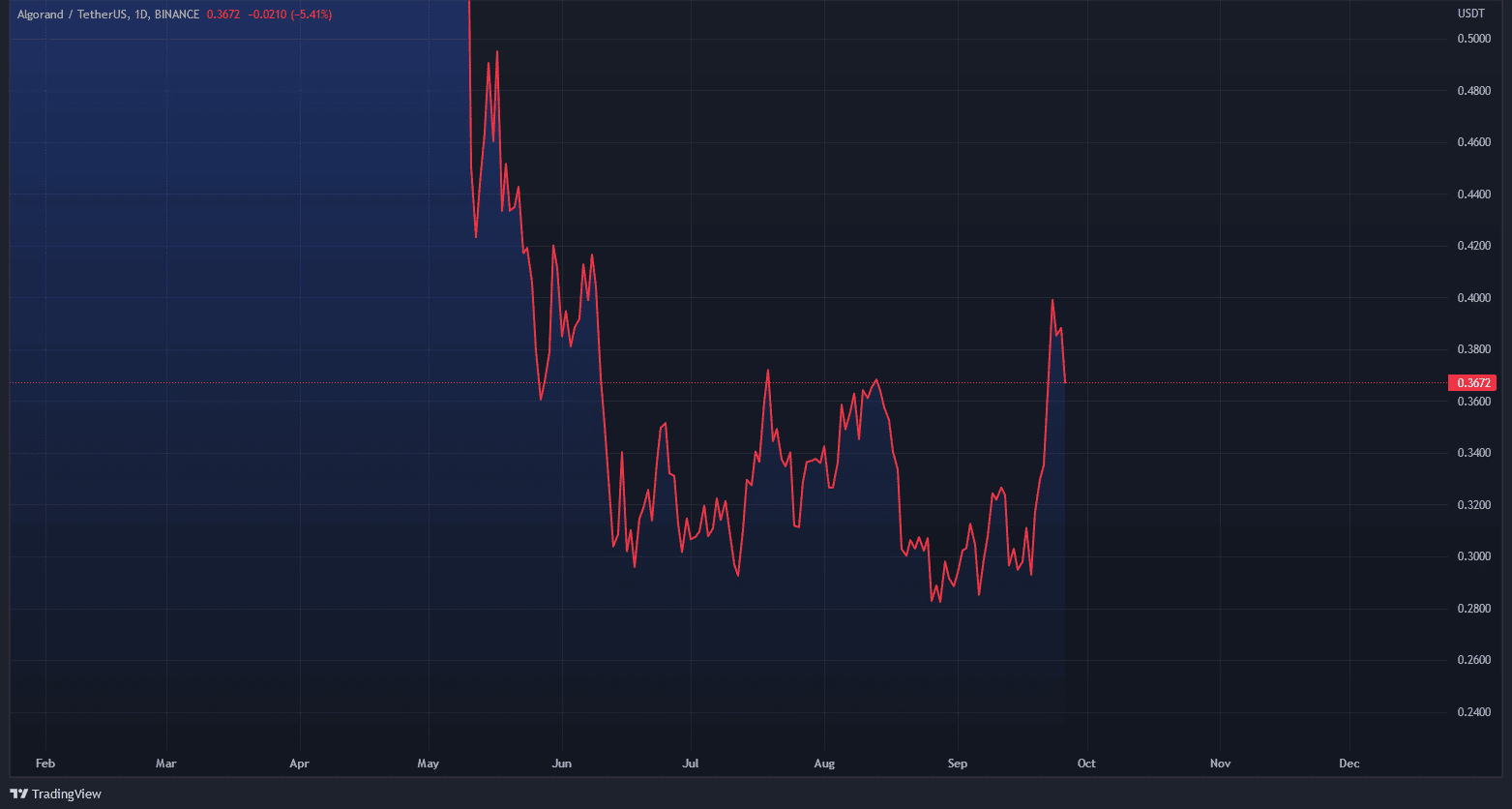 Nárast ceny tokenu ALGO dosiahol za posledné dni takmer o 40 % (36,36 %), čo je na súčasné podmienky pekné číslo. Algorand sa nachádza podľa celkovej kapitalizácie na 29. mieste. V čase písania článku sa obchoduje za 0,367 dolára. Podľa analytikov ide o jeden z popredných blockchainov, ktoré majú v budúcnosti veľký potenciál praktického využitia, o čom svedčí aj spolupráca so spoločnosťou FIFA.