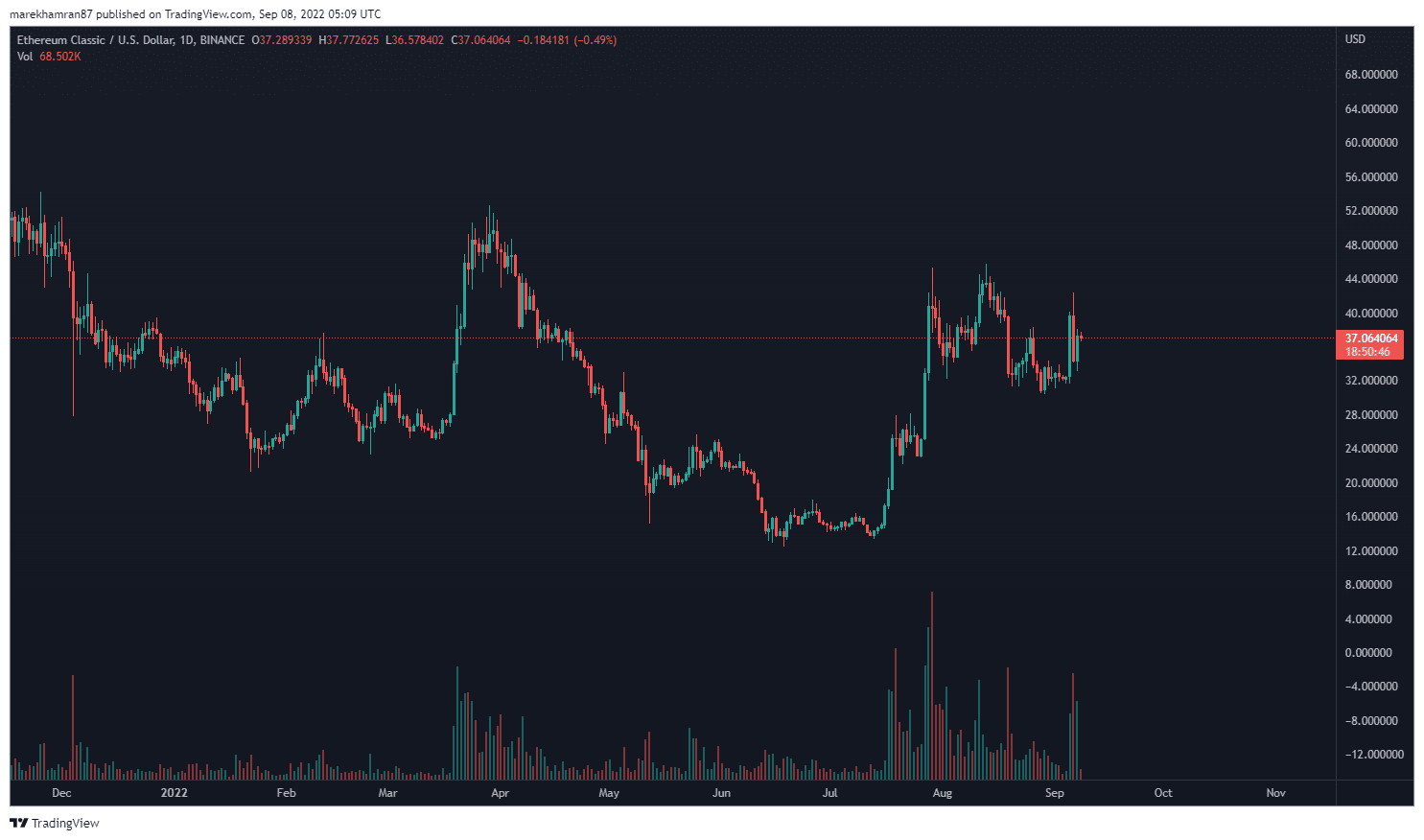 Natívny token ETC zareagoval na tento moment rastom. Za posledných 7 hodín dosiahol zisk viac ako 13 %. V čase písania tohto článku sa cena tokenu ETC pohybovala na úrovni 37,064 dolárov. Za posledných 24 hodín dosiahol zisk viac ako 8 %.