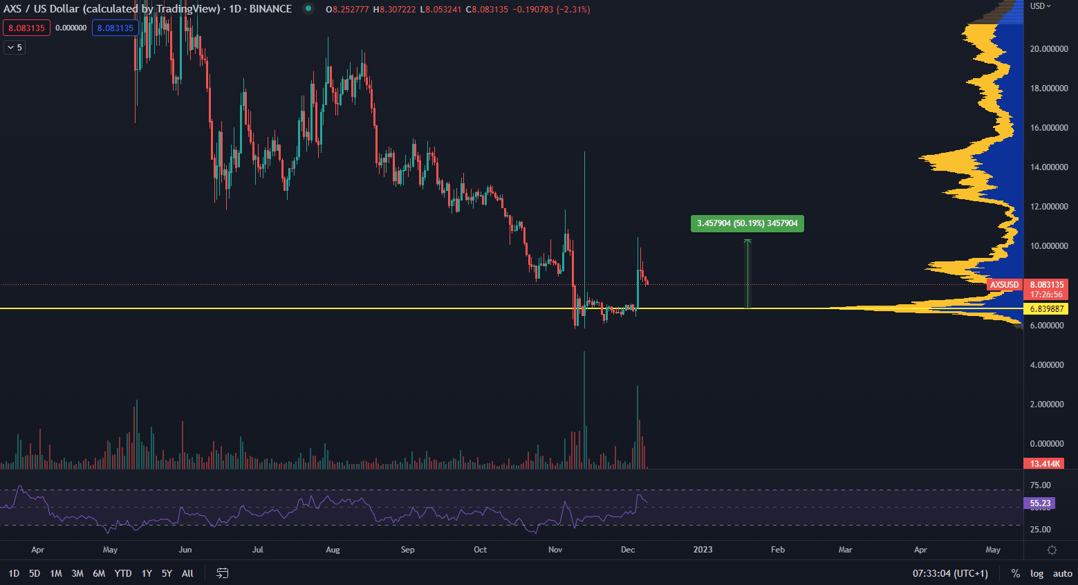 Graf nižšie zobrazuje denné cenové výkyvy AXS. Volatilita za posledné obdobie nabrala na sile, čo možno pozorovať aj na jednodňových vysokých objemoch vo dvoch prípadoch. Je potrebné podotknúť, že za podobné ceny sa AXS obchodovalo pred bullrunom v roku 2021, takže celý predošlý rast bol vymazaný.