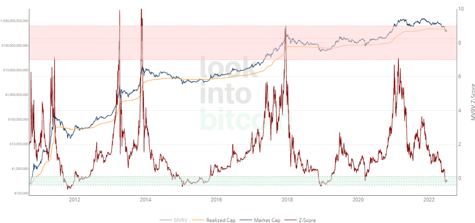 Ako je znázornené na vyššie uvedenom grafe, obdobia, keď metrika z-skóre vstúpila do spodného zeleného pásma, predstavovali dobré nákupné príležitosti pre BTC. Rovnako ideálne nákupné zóny nastali, keď trhová cena klesla pod realizovanú cenu, čo môžeme vidieť hore znázornené modrou a žltou čiarou.