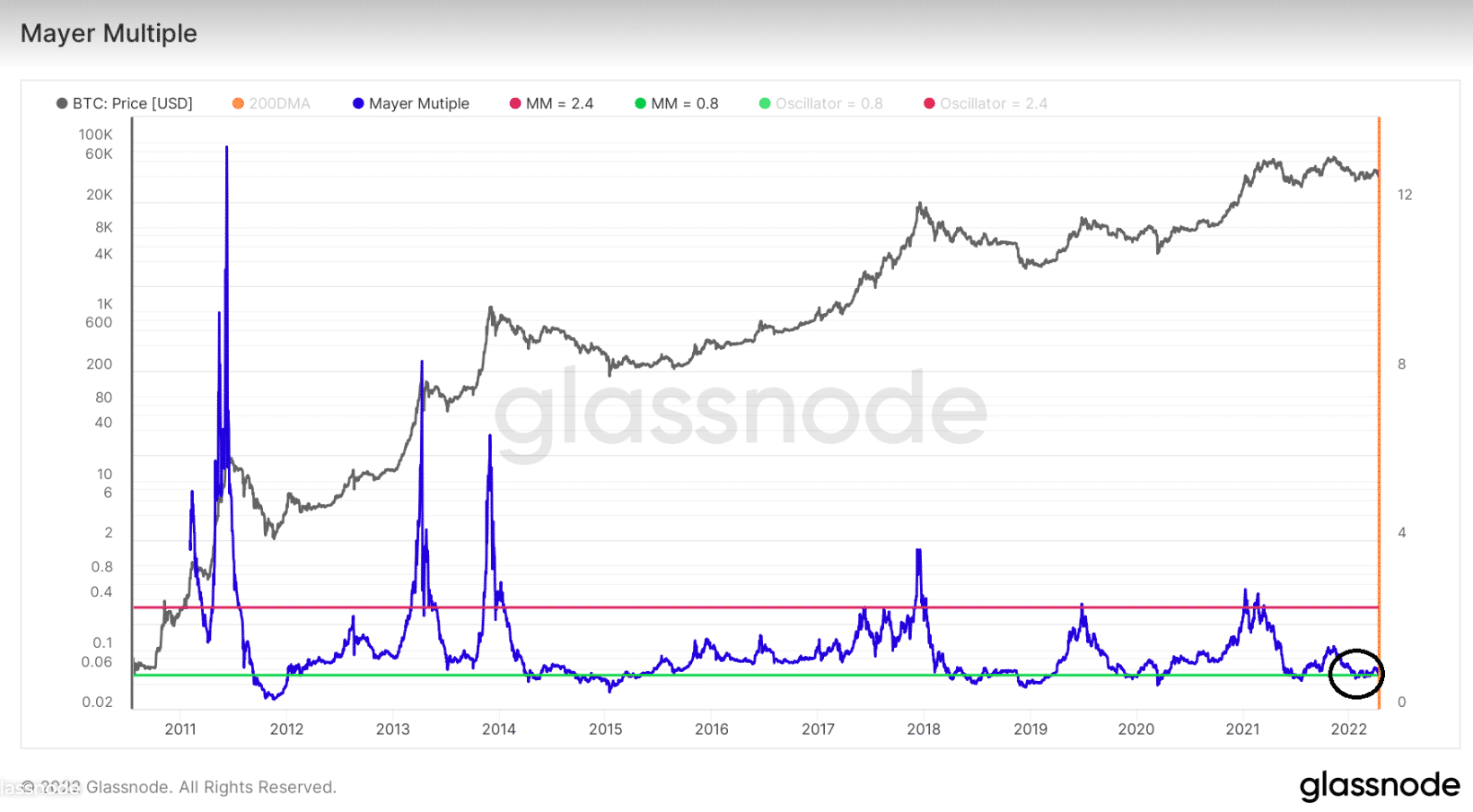 Mayer Multiple je on-chain indikátor. Používa sa na určenie trendu a používa pomer medzi cenou BTC a jeho 200-dňovým kĺzavým priemerom (MA). Momentálne indikuje dno pre Bitcoin a jeho korekciu.