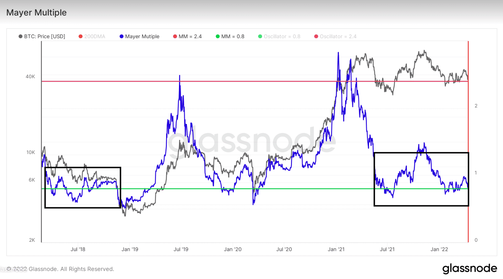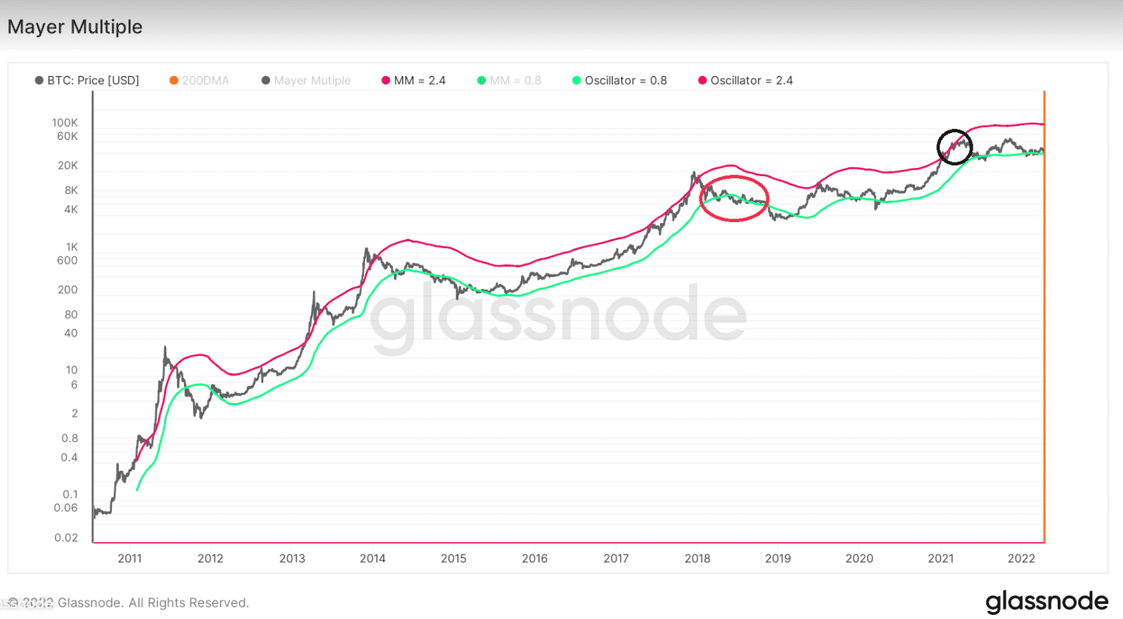 Naopak, dno BTC nie je tak presne určené ako vrcholy. Zatiaľ čo v každom dne sa BTC skutočne posunul pod 0,8 MA, niekedy sa pod ňou pohybuje dlhú dobu, kým dosiahne dno. Bolo to tak v roku 2018 (červený kruh), keď sa cena niekoľkokrát pohybovala nad a pod čiarou.
