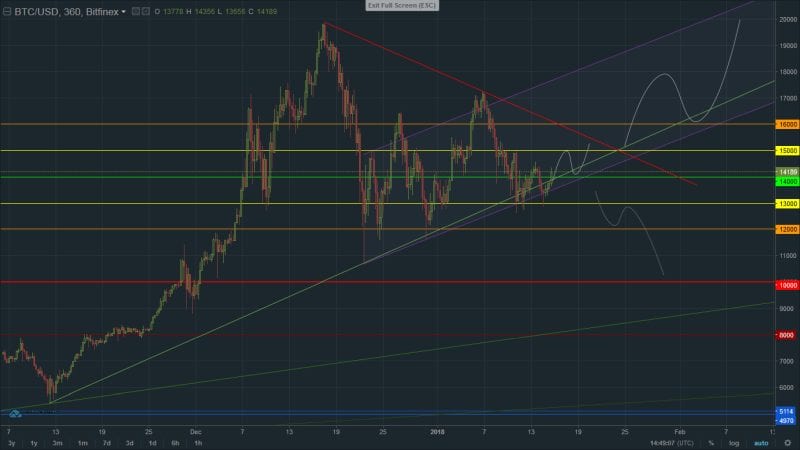 V súčasnej dobe sa kurz pohybuje v pásme 13 – 15k, kedy sa pohybuje v rámci strednodobého obchodného Trend Kanálu. V priebehu posledných dvoch dní (13.-14.1.) trh testoval Support trend line tohto kanálu, kedy sa táto hladina prejavuje ako dobrá pre nákup so stávkou na vývoj kurzu v rámci obchodného kanálu. (Viac v obrázku).
