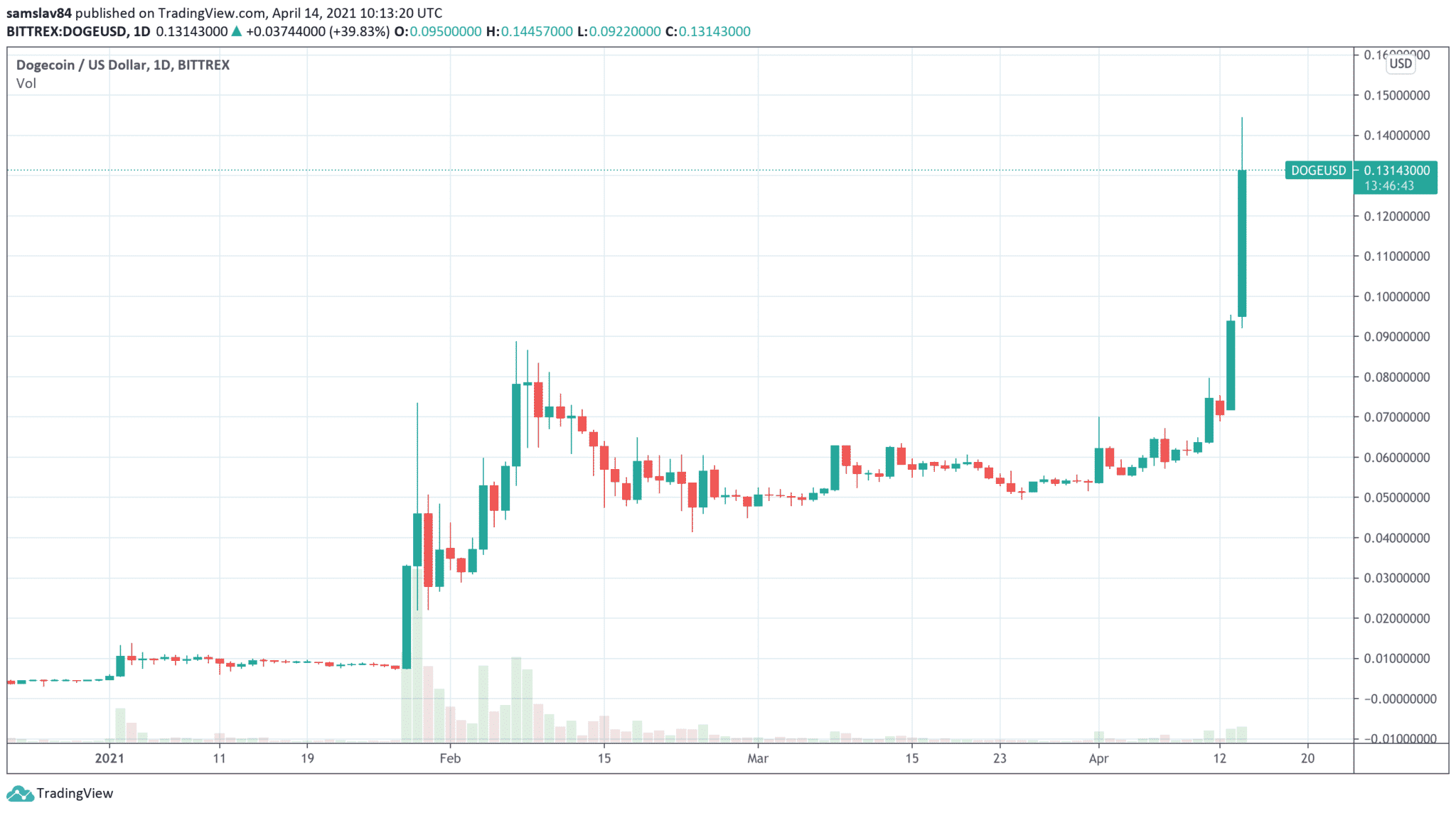 Obľúbená kryptomena Elona Muska má dnes veľký deň. Prvýkrát v histórii prekonala hladinu 0,1 USD. Najvtipnejší coin na svete tak oslavuje nové historické maximum. Na burze Bittrex je to $0,144.
