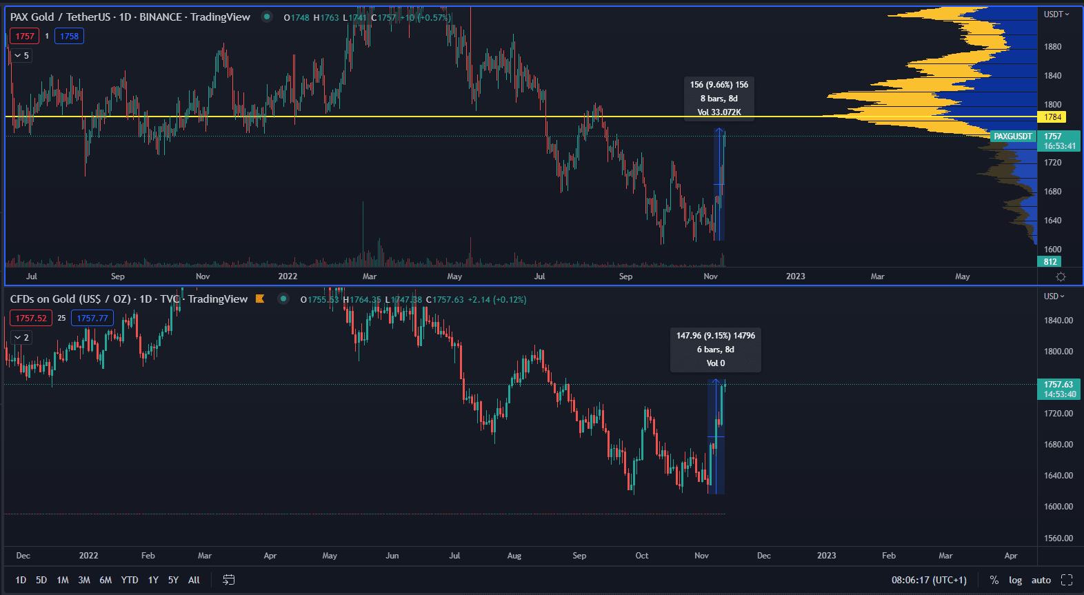 Ako vidíme na grafe nižšie, cena PAXG narástla už takmer o 10 % len za posledných 8 dní. Vo svete kryptomien to nepredstavuje rekordnú volatilitu, no je potrebné si uvedomiť, že kryptomenový trh sa nachádza uprostred veľkých poklesov a cena je viazaná na zlato. Len pre porovnanie, v čase písania článku sa Bitcoin obchoduje o 20 % nižšie ako pred 6 dňami.