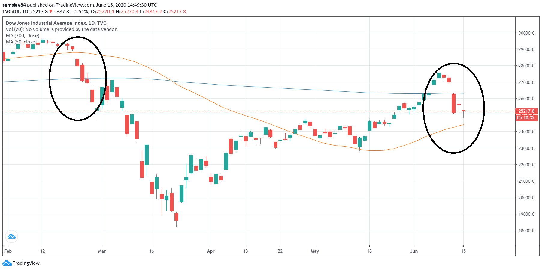 Americké akciové indexy však zareagovali pozitívne a po iniciálnom prepade zo začiatku marca 2020 začali rásť. Dow Jones nakoniec presiahol aj hladinu 27 000 bodov no keď už to vyzeralo tak, že zmaže celý marcový prepad, prišla otočka. Na trhoch sa teraz dvíha panika a celá táto akcia sa veľmi podobá na marec 2020.