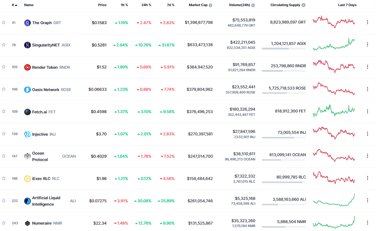 Najväčšou kryptomenou v tejto oblasti je The Graph (GRT), ktorý dosahuje trhovú kapitalizáciu 1,4 miliardy dolárov. Na druhom mieste je SingularityNET (AGIX), s hodnotou 633 miliónov a nasleduje Render Token (RNDR), s hodnotou 384 miliónov dolárov.