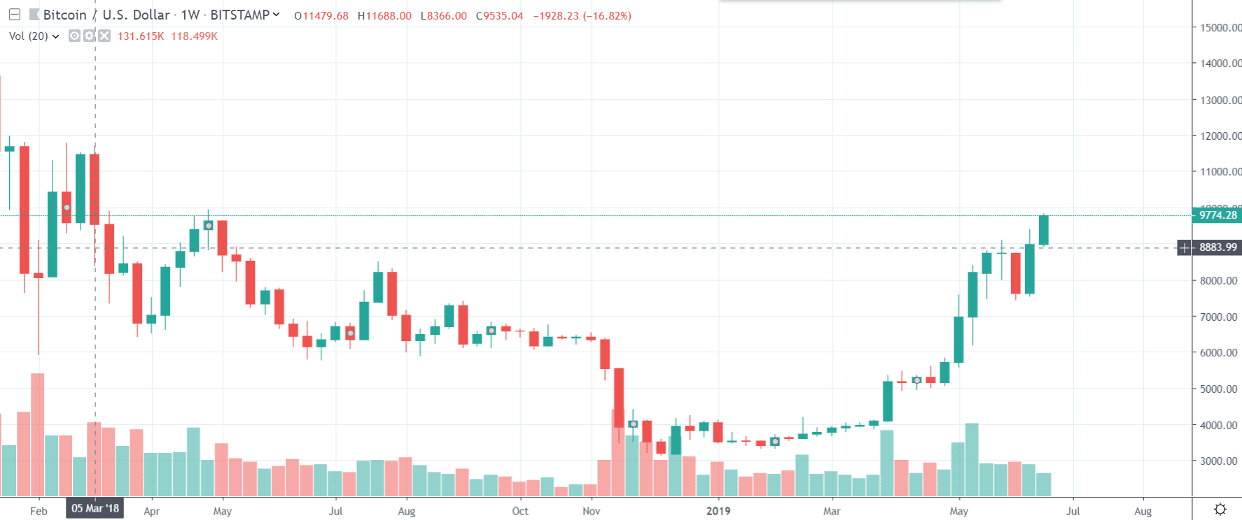 Bitcoin za posledných 24-hodín zaznamenal rast o krásnych 6 % a momentálne sa pohybuje okolo ceny 9 800 $. Po štvordňovej akumulácii tak zase ideme hore. Volume na burzách tiež rastie. Podľa stránky bitcointradevolume.com sa dnes obchodovali BTC za viac než 700 miliónov dolárov. Takmer polovica obchodnej aktivity (300 miliónov) sa odohrala na Binance.
