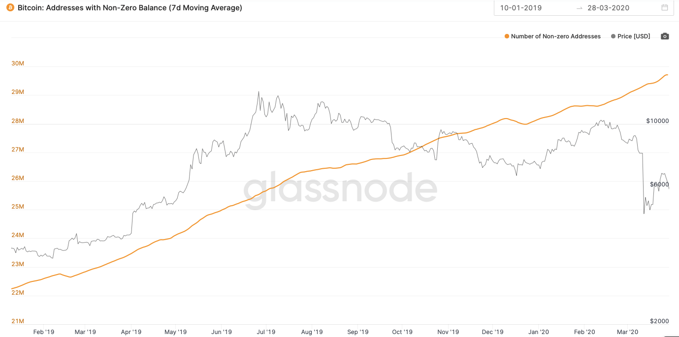 Bitcoin: adresy s nenulovým zostatkom (zdroj: Glassnode)
