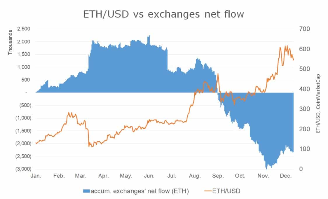 V septembri sa to však začalo otáčať a Ethereum odvtedy z búrz pomaly ubúda. Najviac citeľný bol tento trend v novembri, kedy v priebehu jediného dňa najväčšie burzy opustilo aj 3 000 coinov. To znižuje likviditu trhu a zvyšuje volatilitu. Tzn. Ethereum teraz môže ľahšie rásť, ale aj padať.