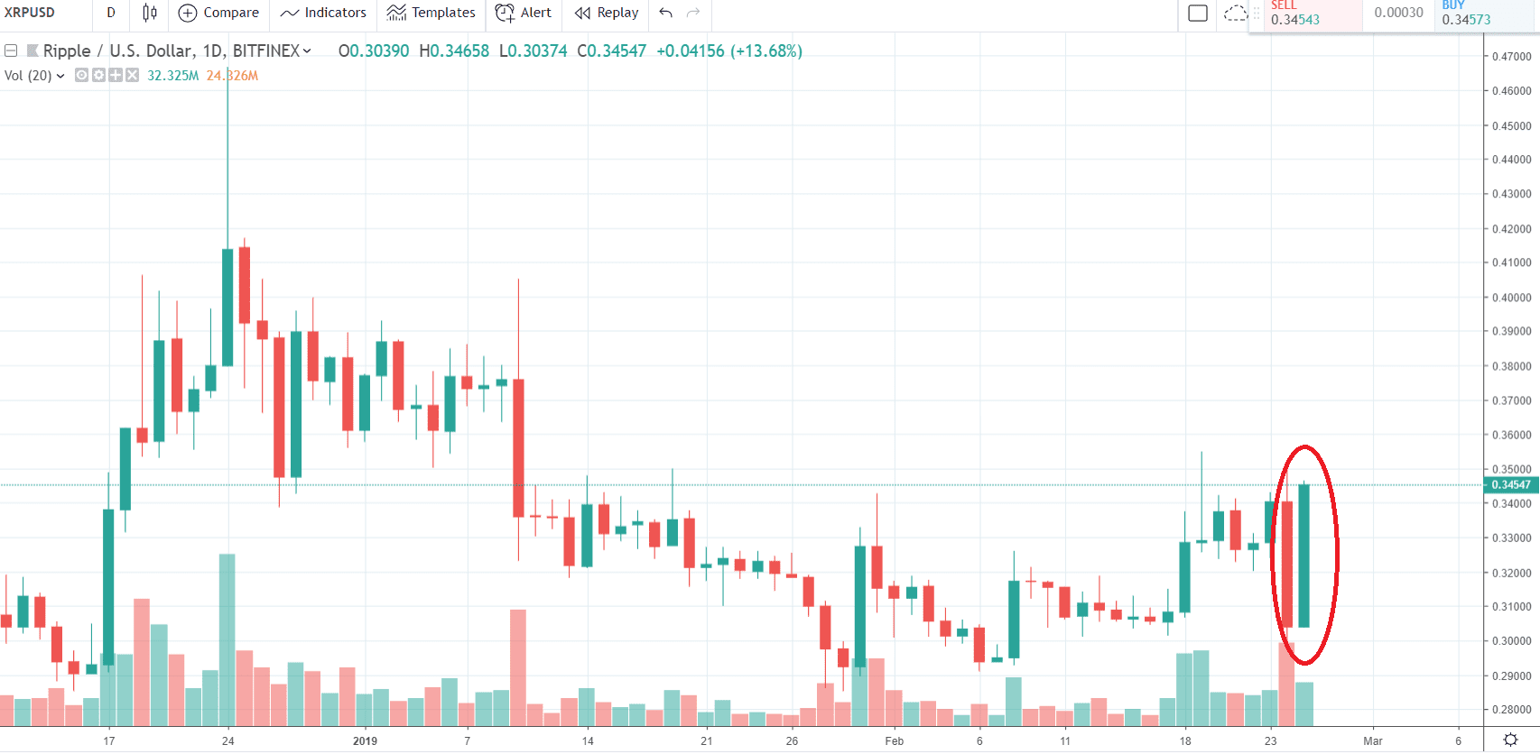 Tretí najväčší blockchainový projekt tak môže oslavovať. Je pondelok večer a párty už očividne začala. XRP za posledných 24 hodín zaznamenal 8,5 % rast. Na burze Bitfinex bol včerajší pokles zmazaný a Ripple by v najbližších dňoch mohol v tomto raste pokračovať. Najbližšiu rezistenciu môžeme očakávať na hladine 0,37 $, ďalšia je potom na 0,45 $.
