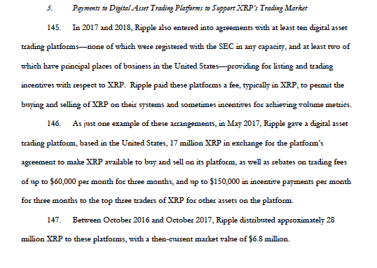 V žalobe od SEC sa uvádza, že spoločnosť Ripple v rokoch 2017/18 zaplatila mnohým kryptomenovým zmenárňam vysoké sumy za zalistovanie ich neregistrovaného cenného papiera.