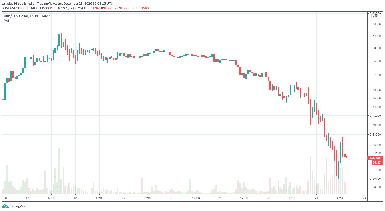 Po obvinení firmy Ripple z predaja neregistrovaných cenných papierov od SEC začali krypto-zmenárne pomaly odstraňovať XRP zo svojich platforiem. Traderi v panike predávajú a cena padá dole rýchlejšie ako meteorit.