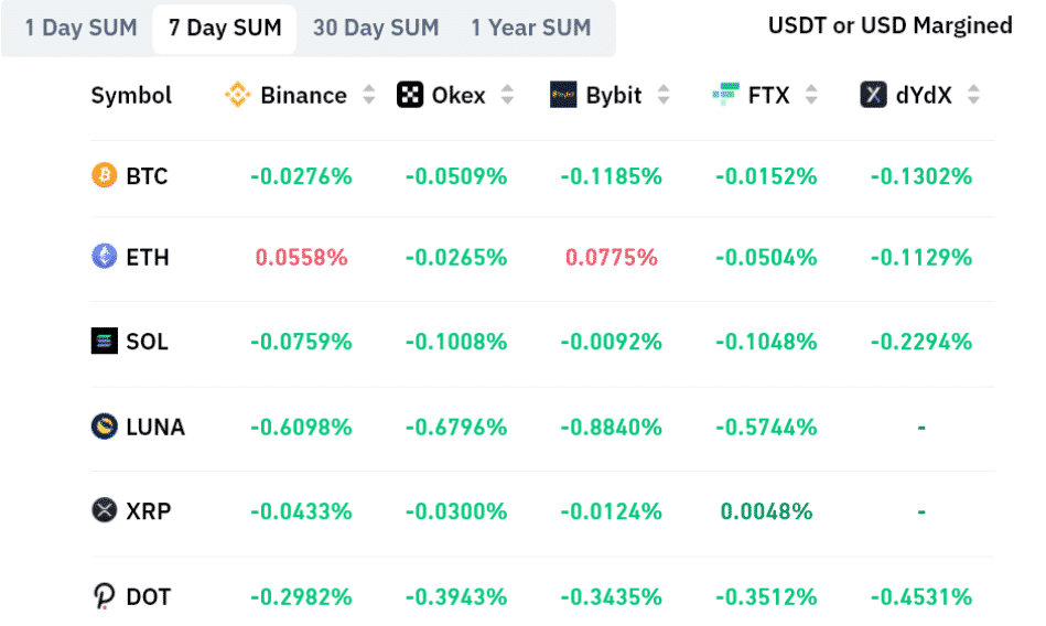 Ako je uvedené vyššie, akumulovaná 7-dňová miera financovania je vo väčšine prípadov mierne záporná. Tento údaj naznačuje mierne vyšší dopyt zo strany shortov. Rozdiel však nie je významný. Napríklad záporná týždenná sadzba Luny 0,65 % sa rovná 2,8 % za mesiac, čo nie je pre obchodníkov s futures príliš znepokojujúce.