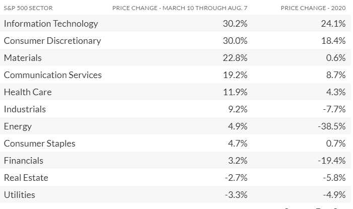 Posledné týždne boli najvýkonnejším odvetvím S&P 500 informačné technológie a aj sektor energetiky, ktorý je najviac zasiahnutý a vzrástol o 11,7% v dôsledku oživenia ceny ropy. Takto sa vyvíjalo 11 sektorov S&P 500 počas prvých 150 dní pandémie:
