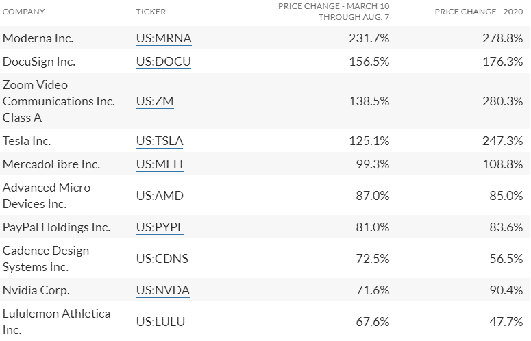 Nasledujúca tabuľka zobrazuje 10 najsilnejších akcií v prvých 150 dňoch pandémie: