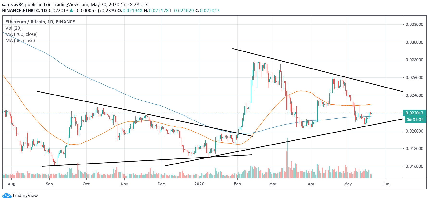 Bitcoin halving sa udial pred 9 dňami a Bitcoin je po ňom napriek pochybnostiam mnohých traderov stále v zisku. Od halvingu už zaznamenal rast o takmer 11% a aktuálne sa obchoduje za 9500 $. Prekonal dlhodobú klesajúcu trendline, no momentálne sa drží pod tohtoročným high – 10 500 $. Jeho prekonanie bude silným bullish signálom pre celý trh.