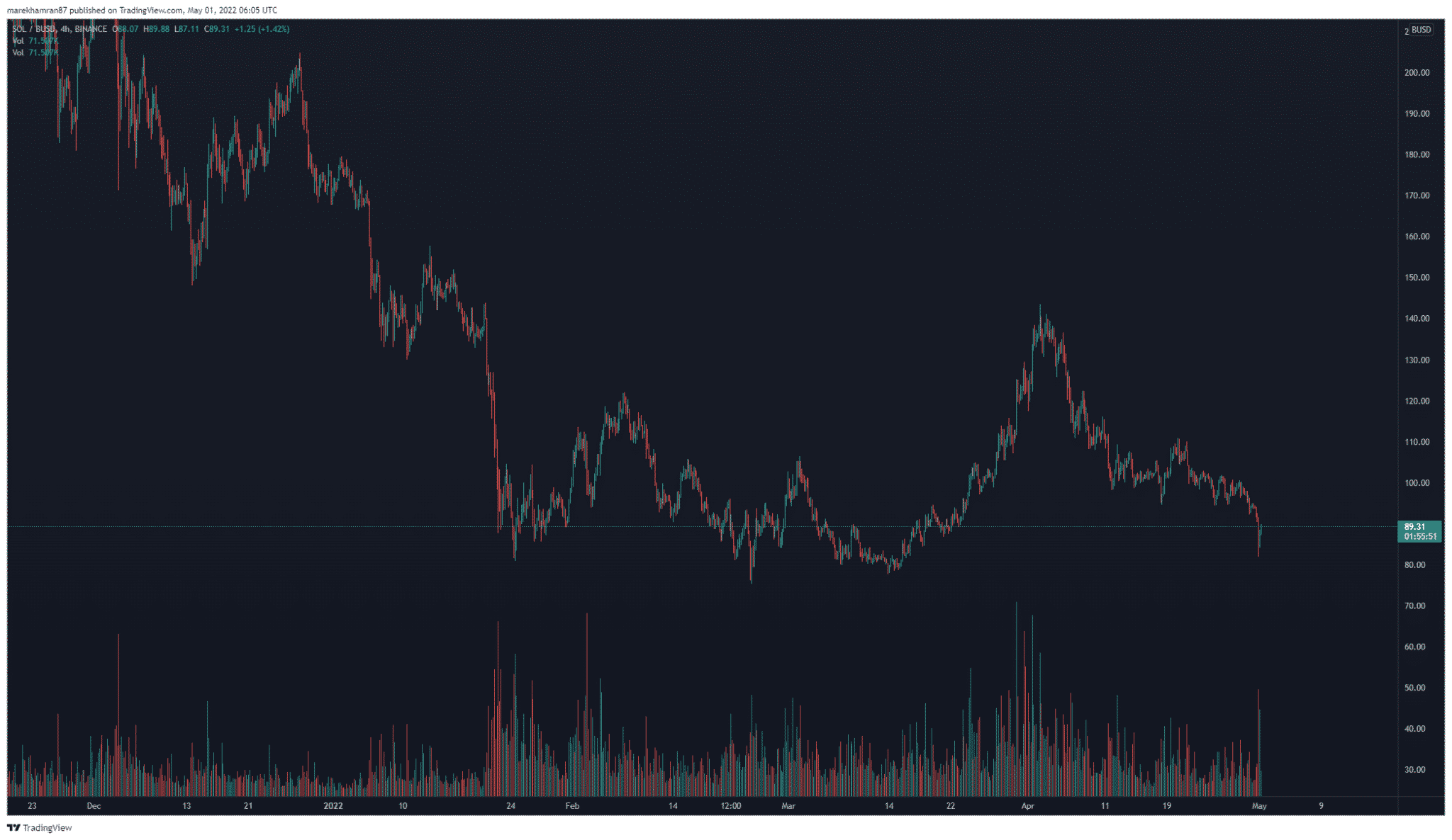 Podľa portálu CoinMarketCap sa v čase písania tohto článku cena pohybovala na úrovni 89,31 USD.