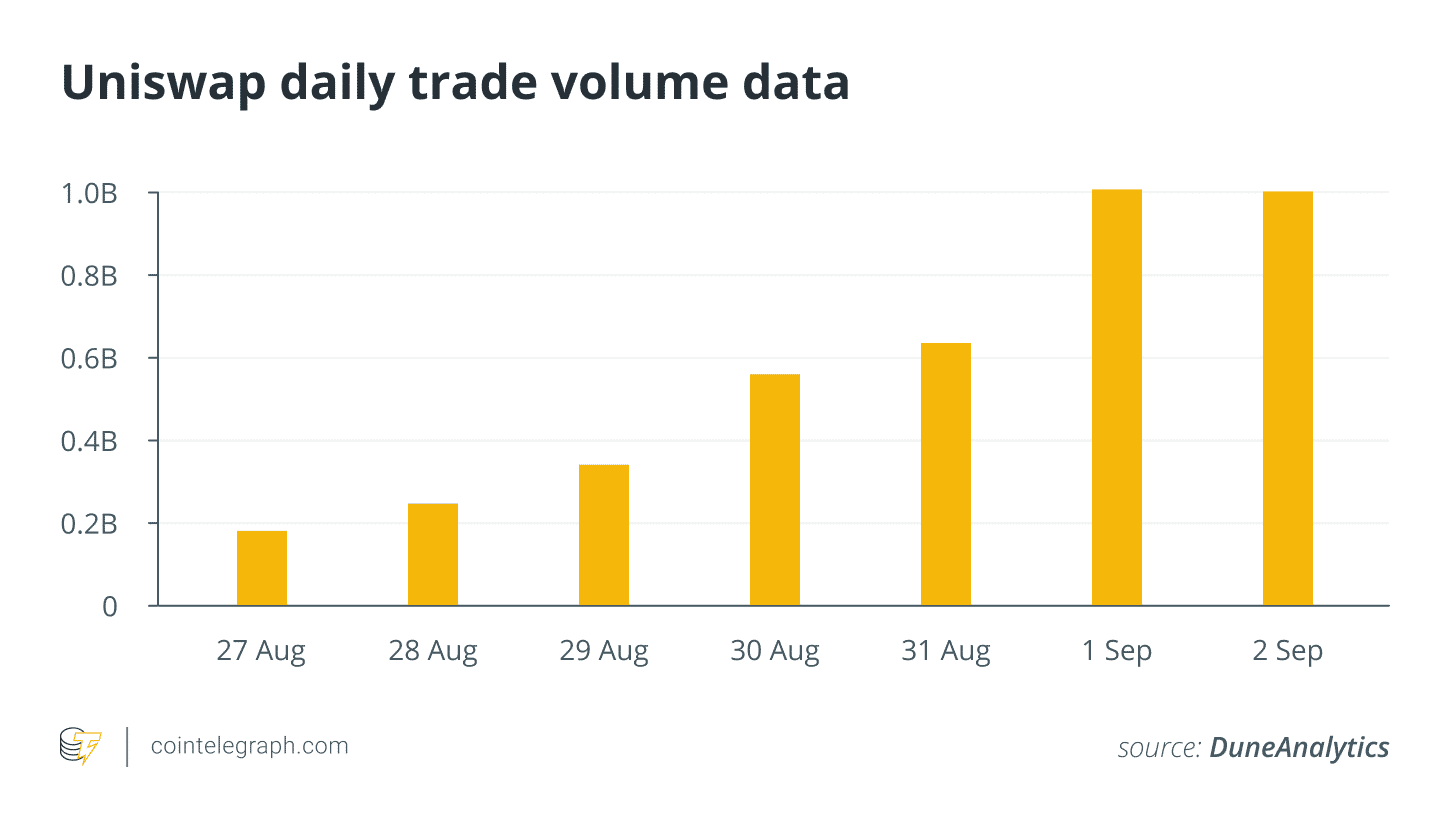 Objem na Uniswape v posledných mesiacoch rýchlo rastie. V súčasnosti dosahuje stovky miliónov a v stredu dokonca prekonal miliardu dolárov. Na platforme obchoduje viac než 90 000 obchodníkov. Najviac sa obchoduje Ethereum za stablecoiny, no populárny je tam aj Sushi, či ďalšie ERC-20 tokeny vrátane WBTC a SBTC, ktoré majú hodnotu Bitcoinu.