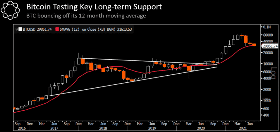 Podľa analytikov spoločnosti Delphi Digital sa 12-mesačný kĺzavý priemer testuje ako podpora a pokles pod túto úroveň by signalizoval ďalšie zníženie ceny BTC.