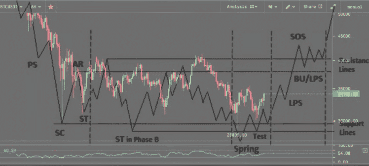 Cena BTC/USDT vs. Wyckoffov model akumulácie. Zdroj: Twitter