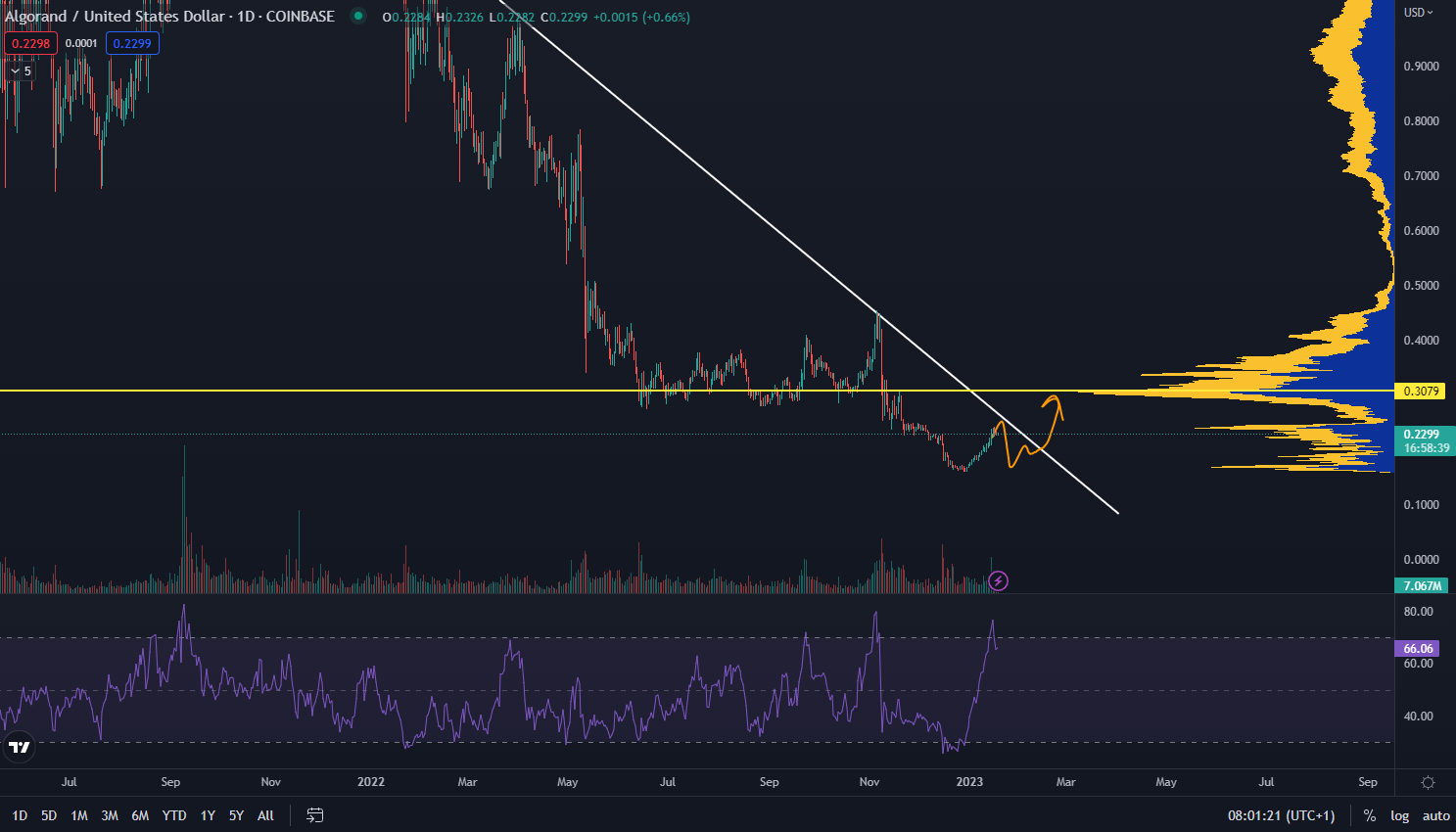 Na grafe z TradingView môžeme vidieť, že ALGO sa obchoduje na úrovni 0,23 dolára. Prvý problém počas rastu môže byť rezistencia z maxím korekcie, no najbližší cenový cieľ je určený na hladine bodu kontroly na 0,30 dolára. RSI zároveň ukazuje vysokú prekúpenosť, čo môže rastúci trend z krátkodobého hľadiska utlmiť.