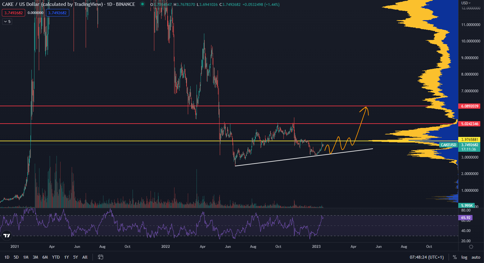 Na grafe z TradingView môžeme vidieť, že CAKE sa obchoduje na cene 3,74 dolárov. Po veľmi dlhej dobe dosiahol vyššie lokálne minimum, čo znamená potenciálnu reverziu trendu. Ak cena prekoná trojitý vrchol na hladine 5 dolárov, cenový cieľ budeme sledovať na úrovni 6 dolárov.