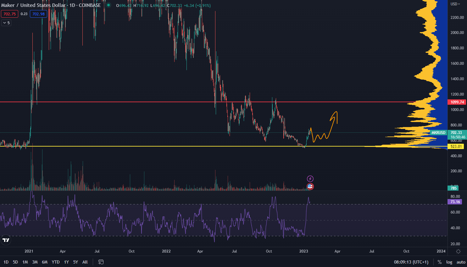 Na grafe z TradingView môžeme vidieť, že MKR narazil na kľúčový support na bode kontroly 523 dolárov. RSI aj tu signalizuje prehriaty trend a z krátkodobého hľadiska je reálne vytvorenie lokálneho maxima. Napriek tomu cena chytá bullish momentum a cenové ciele sú na hladinách 900 a 1 100 dolárov.