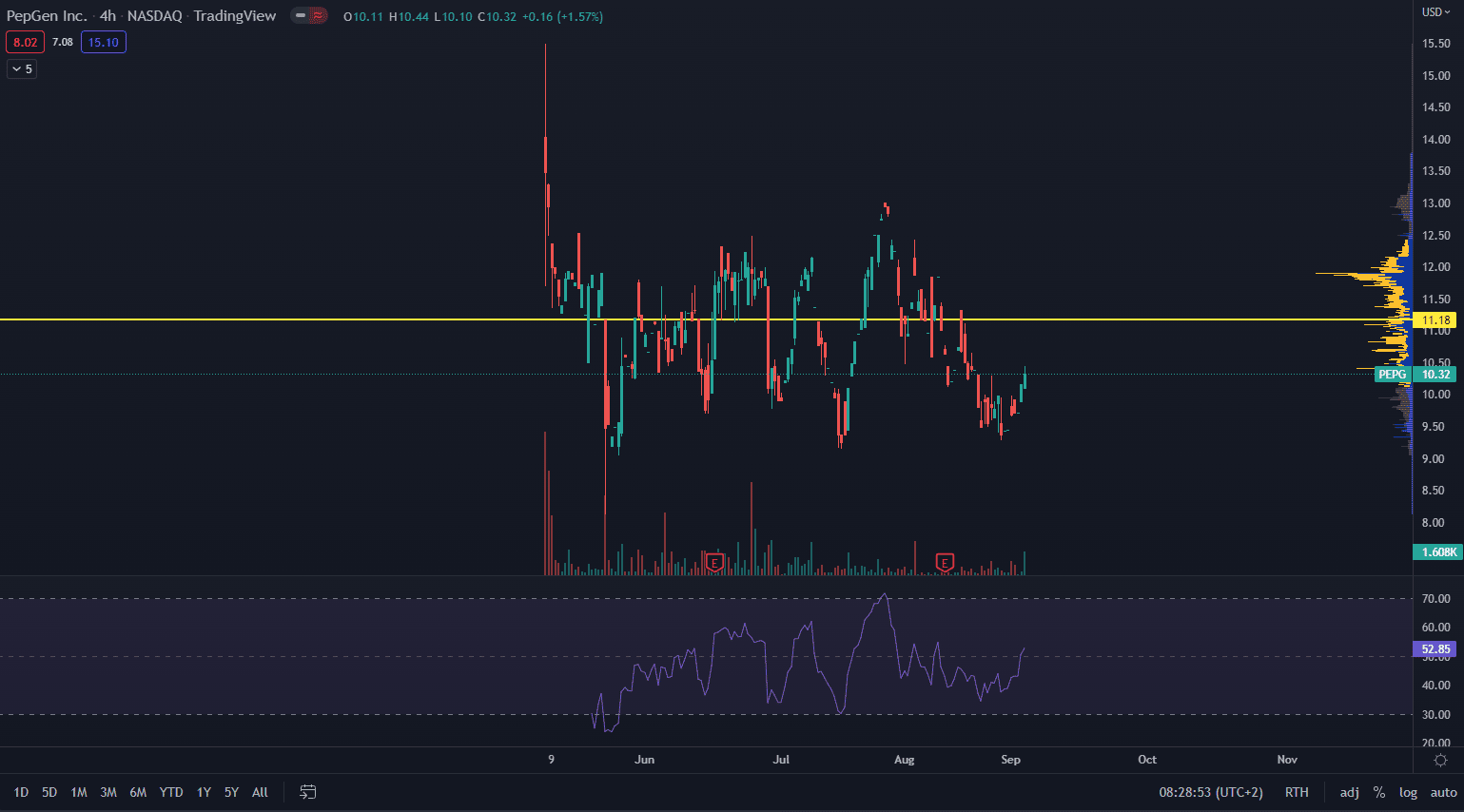 Firma PepGen so sídlom v Massachusetts sa zameriava na výskum neurologických a neuromuskulárnych ochorení a má vlastné lieky na svalovú dystrofiu. Spoločnosť je zatiaľ v čistej strate 17,3 milióna dolárov. Cena od uvedenia na Nasdaq sa obchoduje do strany, pričom support sa nachádza na hladine 9,20 dolárov.