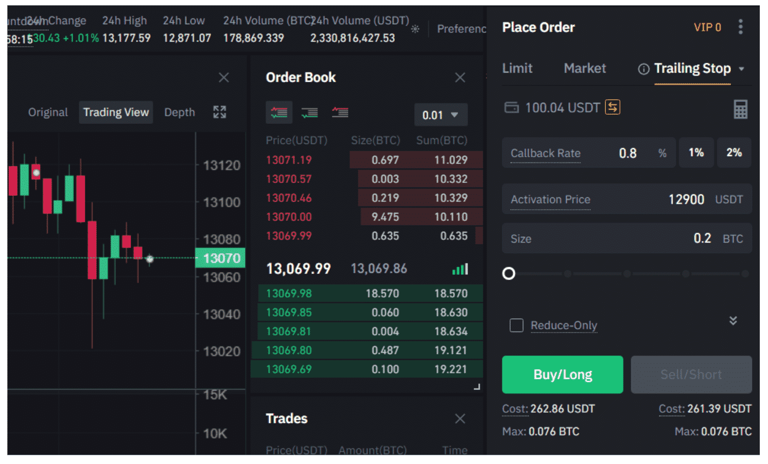 Vo vyššie uvedenom príklade má tento trailing stop nákupu (long) aktivačnú cenu 12,900 dolárov. Zatiaľ čo teda trh naďalej obchoduje nad touto úrovňou, táto objednávka zostáva nečinná.