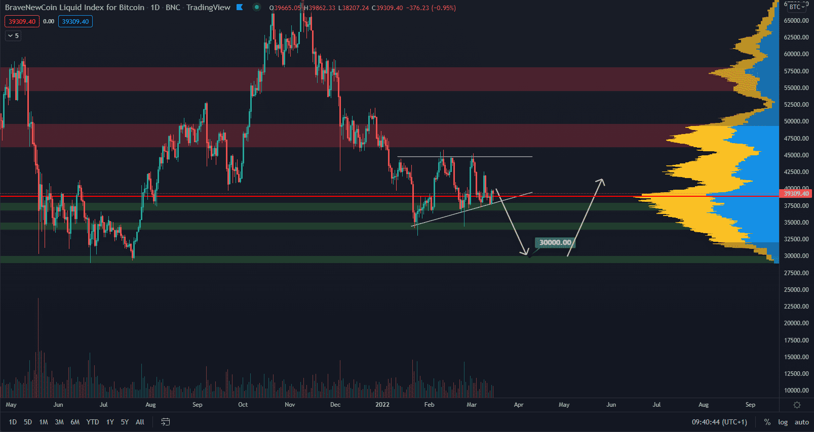 Bitcoin posledné týždne viac-menej stále pokračuje v sideway pohybe medzi 34 000 $ a 46 000 $. Obchodovať takúto štruktúru so sebou vždy nesie istú dávku rizika, pretože s istotou nie je možné určiť, ako sa ukončí. Ak cena prekoná 46 000 $, oficiálne nastáva počiatok rastúceho trendu. Čo však v prípade, ak cena neudrží súčasnú formáciu a bude klesať? V tomto článku sa pozrieme na top 3 scenáre, kam by cena mohla spadnúť a kde sú zároveň ideálne nákupné zóny.