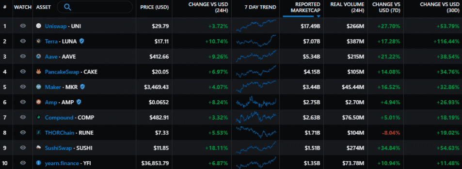 Údaje z Messariho DeFi Asset indexu ukazujú, že za posledných 30 dni získala väčšina z 10 najlepších tokenov v sektore viac ako 20 %. Terra (LUNA) s najvyšším ziskom zaznamenala nárast cien o viac ako 116 %.