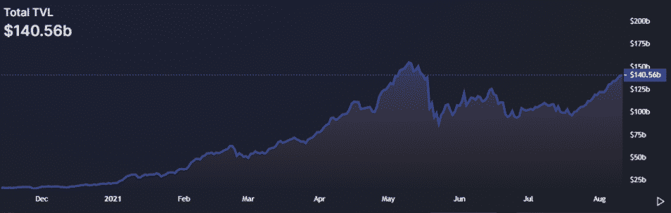 Údaje z DeFi Llama ukazujú, že celková uzamknutá hodnota (TVL) na platformách DeFi sa blíži ku svojmu ATH na 155 miliárd dolárov. V súčasnosti predstavuje 140,56 miliard dolárov.
