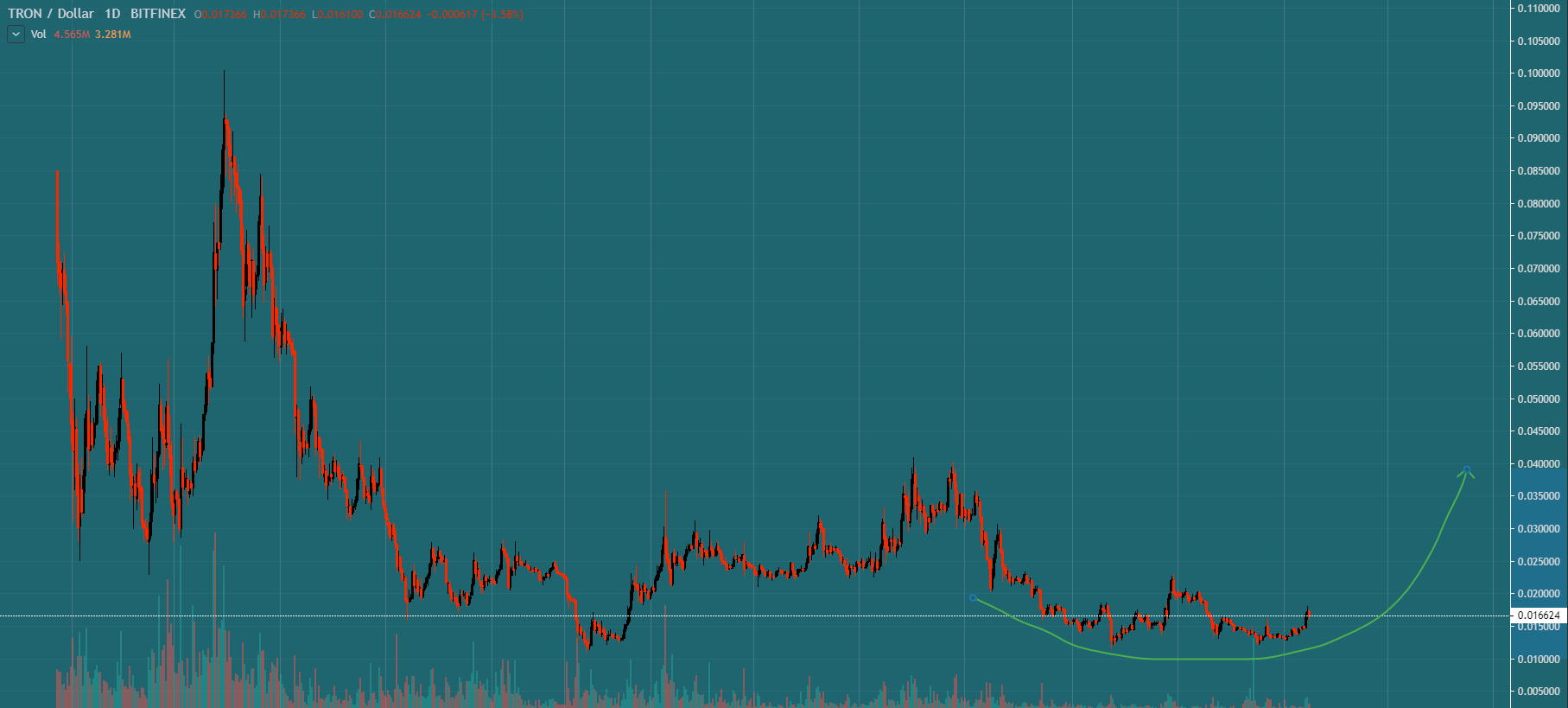 Ďalší za mňa veľmi silný coin je TRX. Asi každý máme ešte v živej pamäti uptrend zo začiatku minulého roka. Od leta to už bol len pokles a nuda. XRP a TRX boli coiny, ktoré až tak uptrend nepostretol. Rovnako v poslednom raste tento týždeň sa tieto coiny držali relatívne na uzde. TRX vytvára akési guľaté dno a cesta ku 0.04 – 0.05 USD je podľa mňa otvorená. Navyše, je tu faktor Justin Sun, ktorý je veľmi dobrý marketér a častokrát vie Tron vypumpovať na svojom Twitteri. Väčšinou to býva tak, že coiny, ktoré dlho spia, potom svoj rast predvedú.