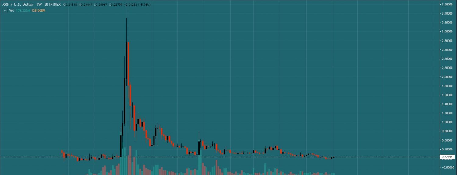 Ako prvý som zvolil XRP. Tento coin má okolo seba veľkú kontroverziu, ale napriek tomu sa stále drží na treťom mieste na coinmarketcap-e. Každý si o projekte môže myslieť svoje, ale jedno je isté. XRP vie, ako sa robí veľký „hajp”. Okolo tohto coinu je obrovské ticho a keď sa pozrieme na weekly graf, tak vidíme, že vždy po nejakom čase príde pumpa.