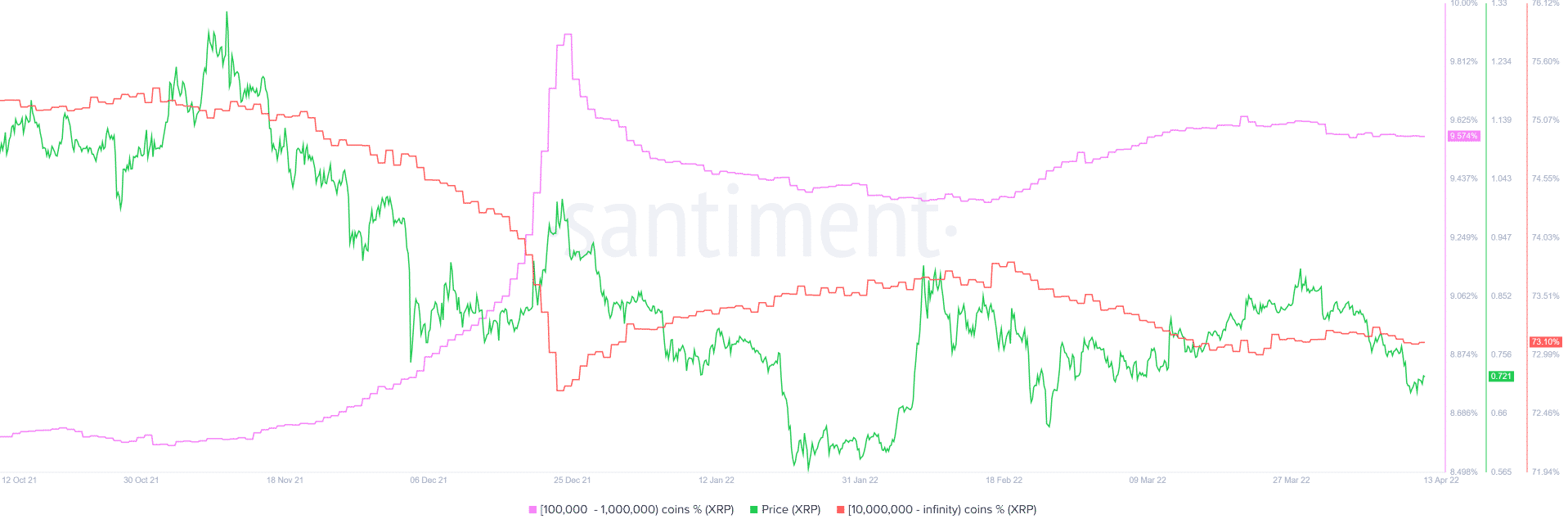 Distribúcia ponuky ukazuje negatívnu koreláciu medzi peňaženkami, ktoré držia 100 000 až 1 milión a 10 miliónov alebo viac tokenov XRP. Prvá kategória dosiahla vrchol 9,9 % 24. decembra, kým druhá kategória bola na úrovni 72 %.