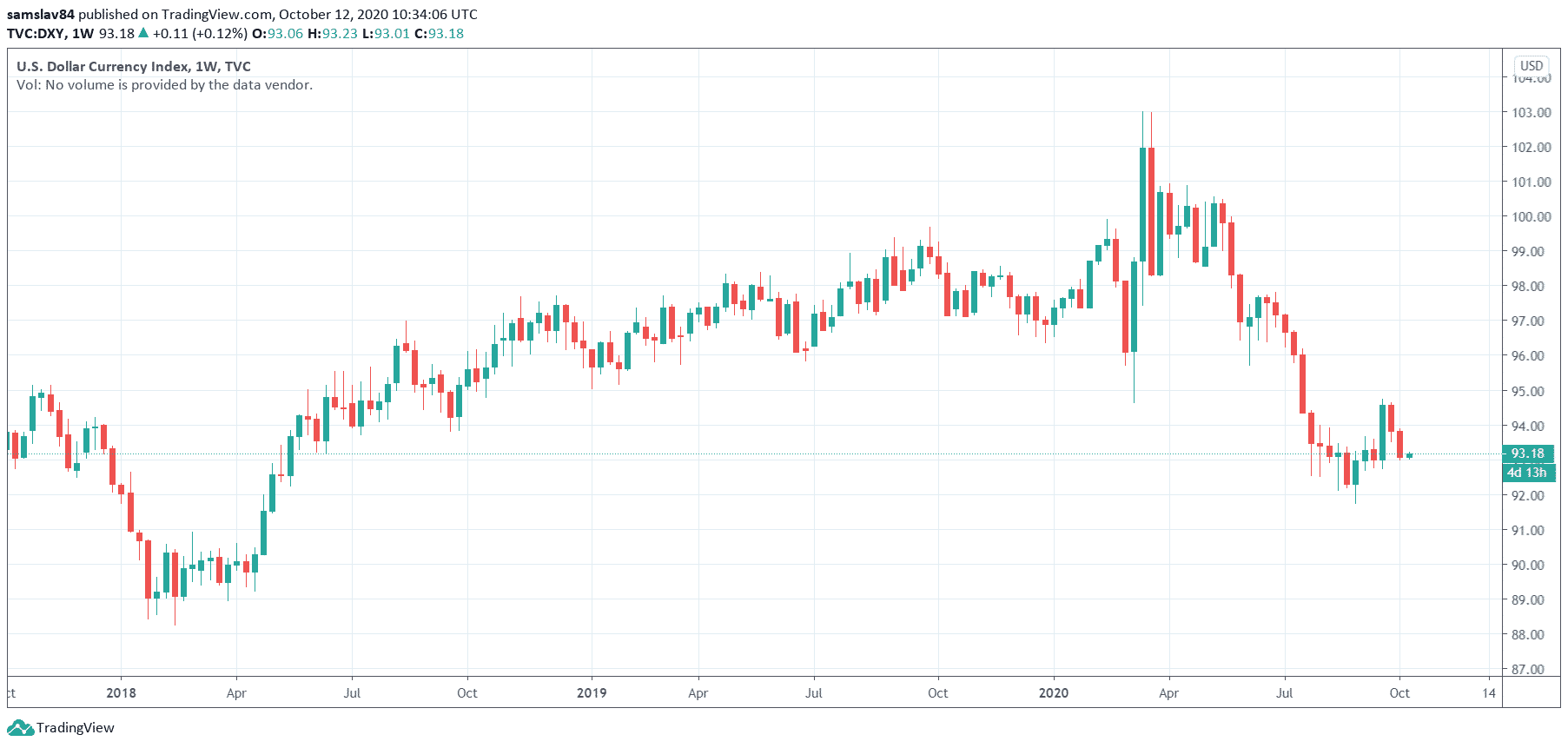 US Dollar Currency Index (DXY) pred voľbami opäť začal klesať a analytici očakávajú, že v prípade zvolenia Joa Bidena za nového amerického prezidenta bude pokračovať až na low v roku 2018. Vtedy sa zastavil na hladine 89 bodov – o 4% nižšie než tohtoročné dno. Aktuálne sa pohybuje okolo 93 bodov.