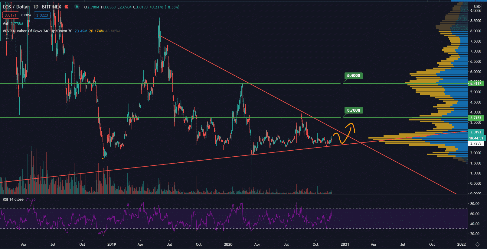 Eos je prvý zo zoznamu top 5 a to práve preto, že do konca roka by mal uzavrieť konsolidačnú štruktúru symetrického trianglu, ktorý je prítomný po celý rok. Práve uzavretie tohto patternu by mohlo znamenať nastolenie nového uptrendu s prvými targetmi na 3,70$ a 5,40$. Ako som však povedal, uzavretie môže nastať až na prelome rokov.