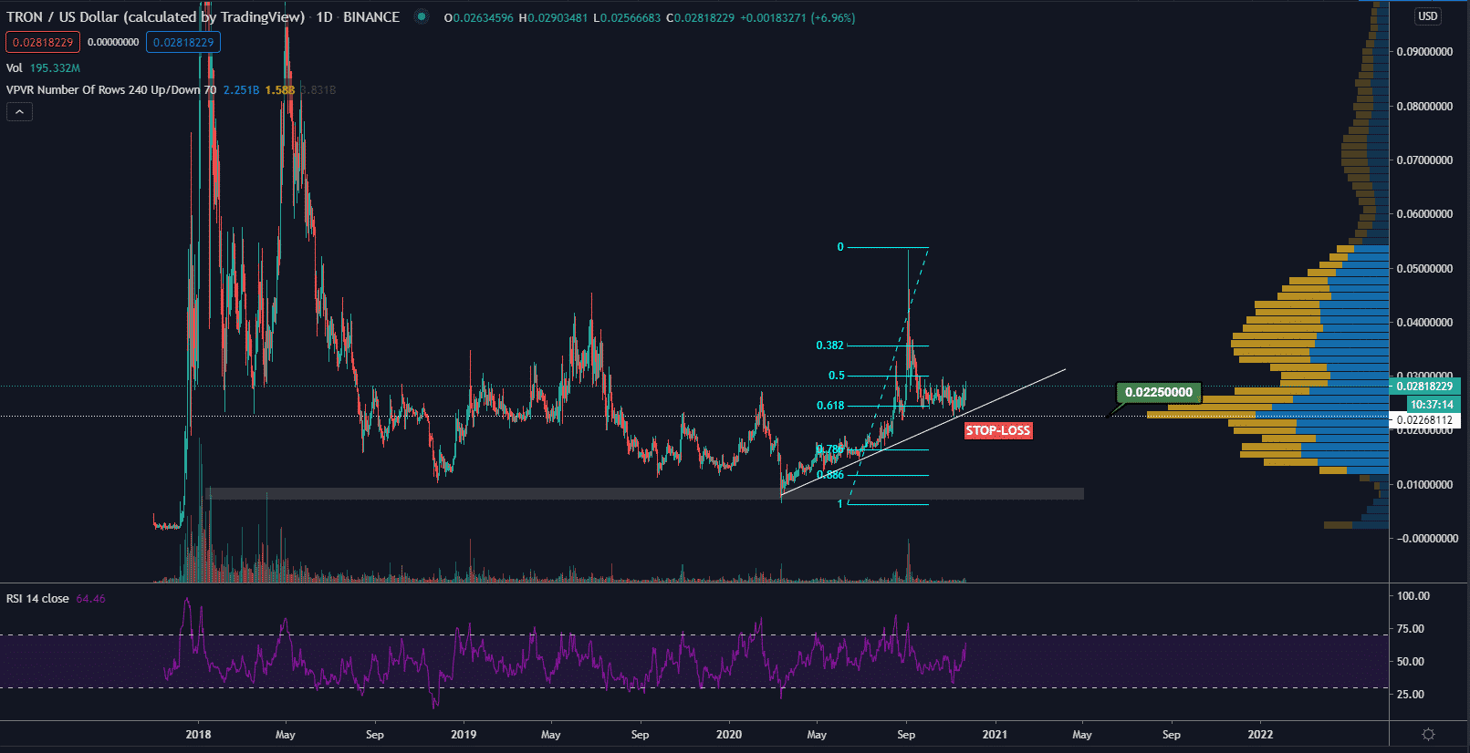 TRX po prudkej pumpe padalo v korekcii nadol, no nedávno sa cena odrazila od podpory, kde sa nachádza point of control na hodnote 0,0225$. Okrem toho je tam aj podpora pozostávajúca z miním celého rastu. Očakávam tak, že aj TRX bude jednou z top možností kam vložiť peniaze na najbližšie obdobie. Budeme tak atakovať prerazenie predošlého lokálneho maxima. Pre istotu však zadávame stoploss pod podporu.