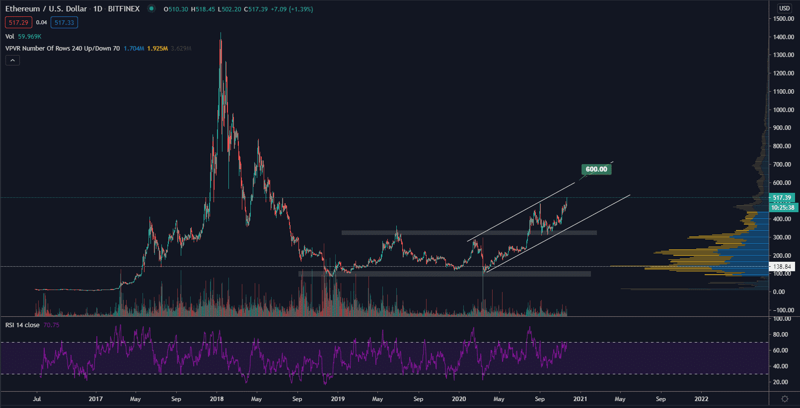 Ethereum je v trende už očosi dlhšie no stále je na míle ďaleko od dosiahnutia ATH, čo v porovnaní s BTC hovorí o veľkom rozdiele. Tento trend je však stále atraktívny a hlavne stabilný. ďalšia rezistencia je na 600$, no trend pravdepodobne nebude mať problém túto hodnotu prekonať. Posledná významná podpora bola otestovaná na 320$. Najbližšie dni však očakávam pokračovanie trendu namiesto korekcie.