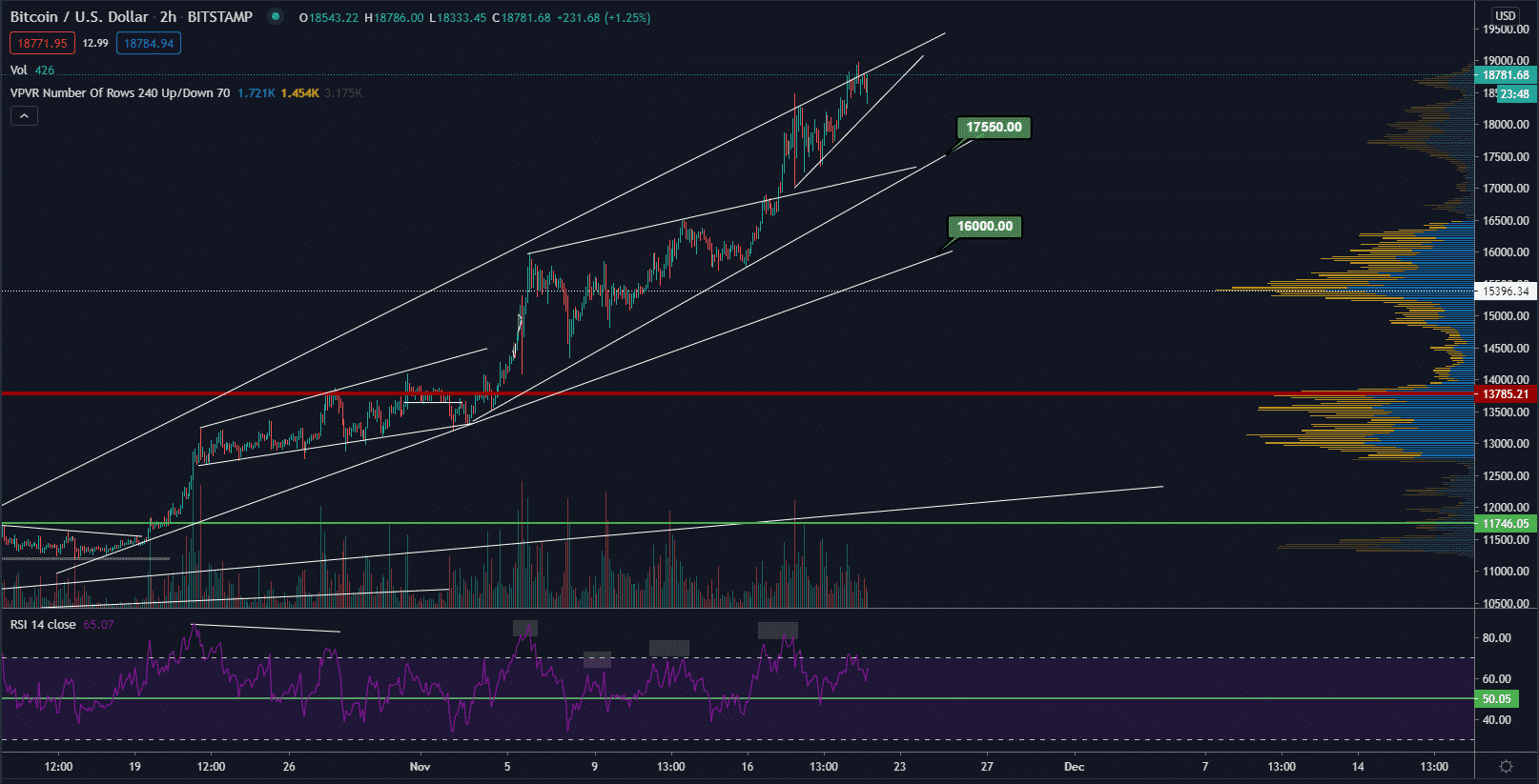 Cena indikuje podpory na hodnote 17,550$ a 16,000$. Momentálne sa uzatvára ďalší krátkodobý rastúci klín. Ak by sme vyleteli z jeho podpory, tak 17,550$ by bolo reálnych. Tieto klíny však sú počas tohto trendu časté a vždy sa končili pokračovaním rastu. Aj keď budeme sledovať menšie korekcie BTC, je to zdravý jav, ktorý podporuje myšlienku stabilného rastu.